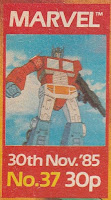 The first two, numbers 27 and 28, both used the same picture in the cover box - a rather hard to decipher at such small size clip from the very first cartoon animation created for the first Transformers toy commercials. It's the planet Cybertron, a spaceship and some lasers. But after that, we launch into a series of cover box pictures from the Optimus Prime commercial footage - used in Britain for an Optimus and Soundwave advert, but originally intended for Optimus versus Megatron. The Megatron toy wasn't released over here at first, because of the way it transforms into a very realistic gun...